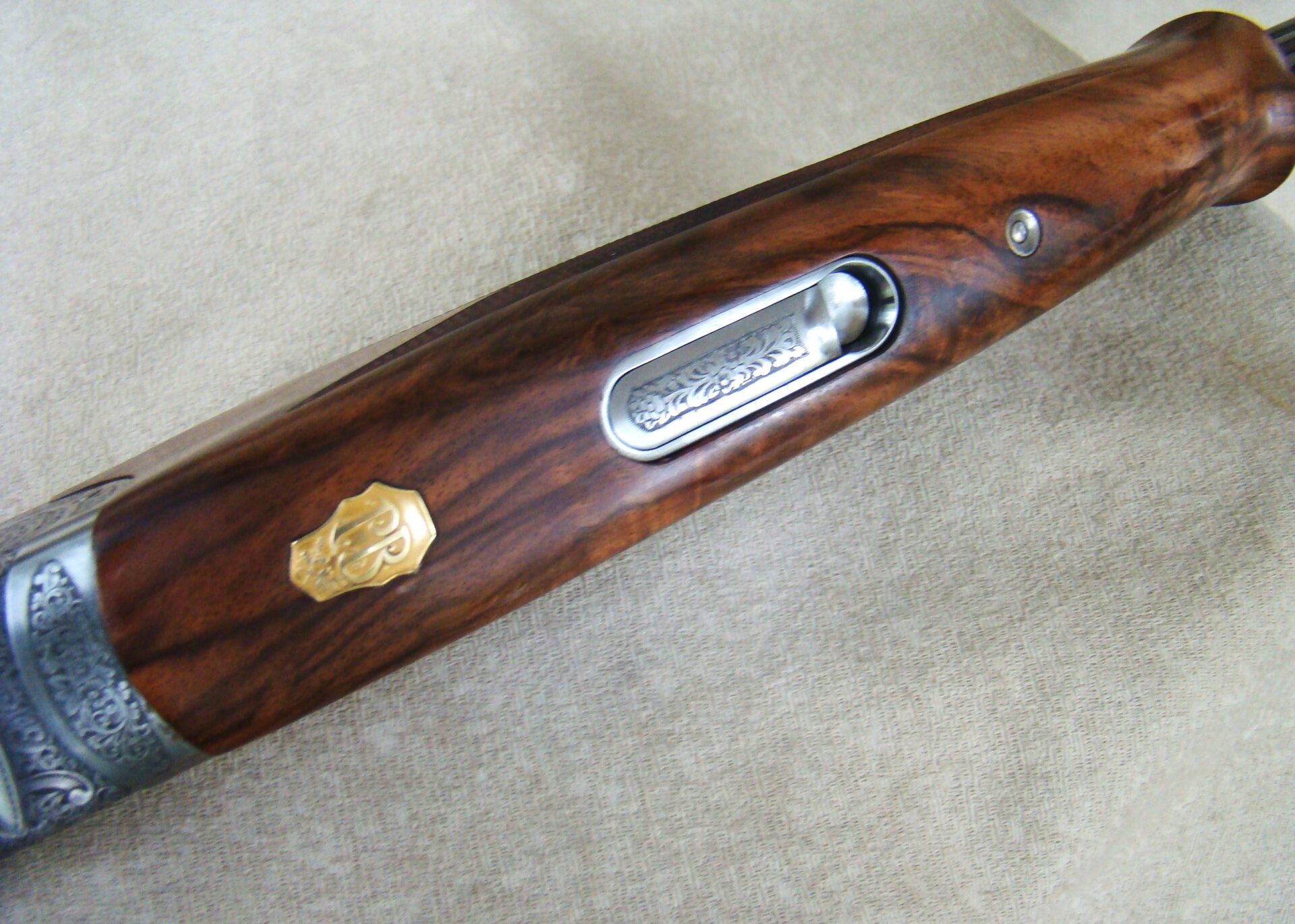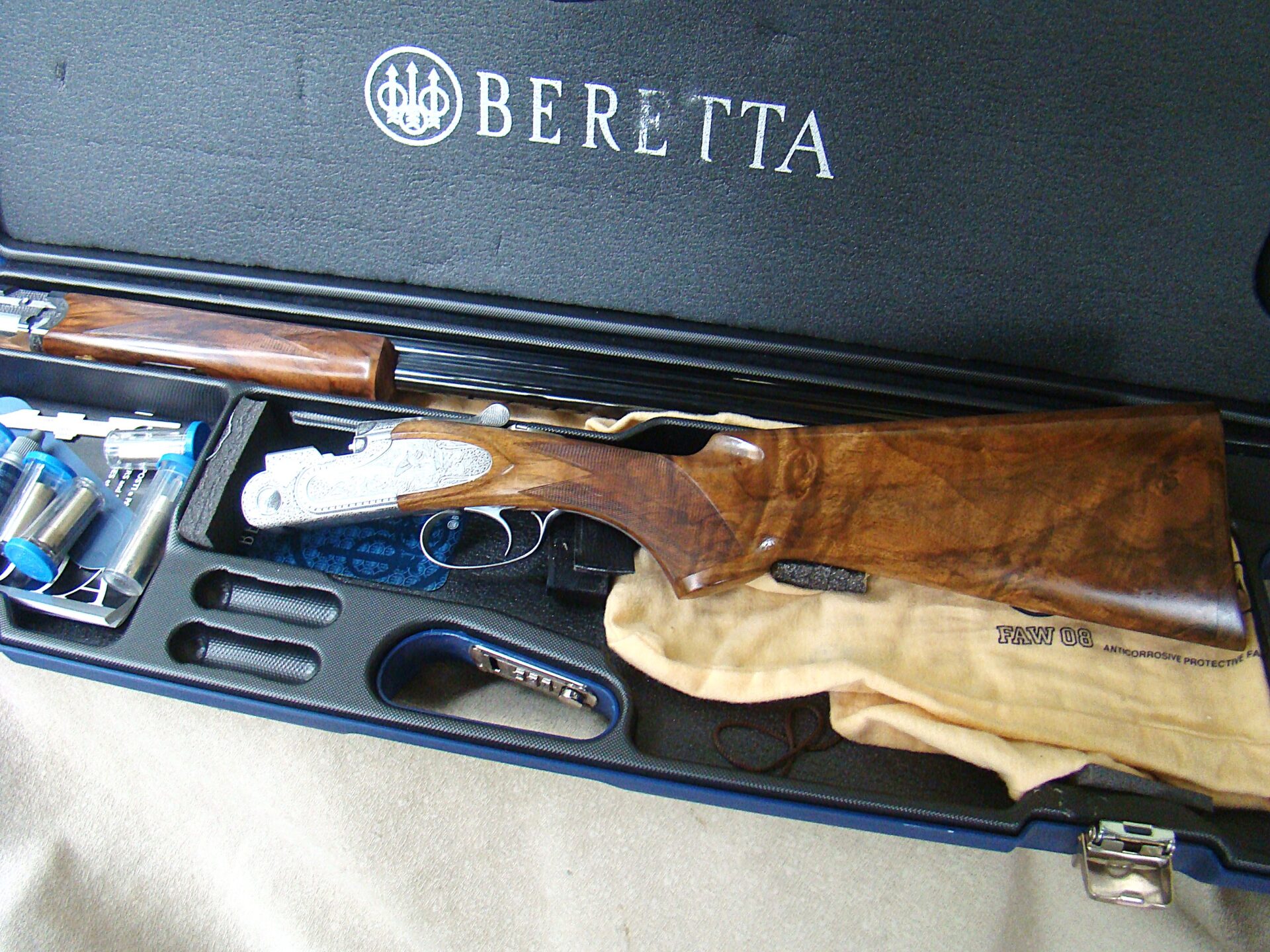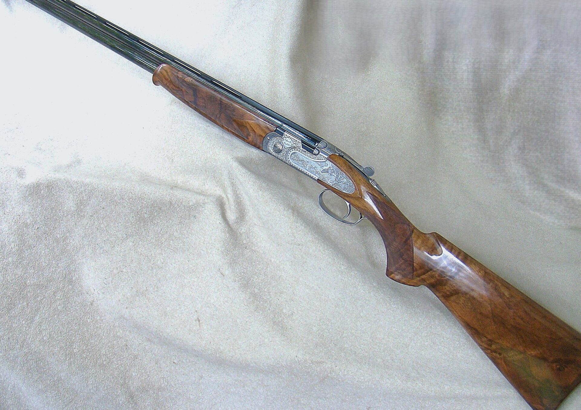 Fabulous Beretta 28 ga. Giubileo, 30″ Excelsior steel vent rib multichoke barrels, 2-3/4″ chambers. Top of the line side plated model features coin finished action with extensive game scenes and floral acanthus scroll. The Giubileo models are finished in the SO workshop to the highest standard of fit and finish. Pistol grip stock with extensive marbled figure against a caramel colored background measures 1-1/4″ comb, 2″ heel, 14-1/2″ LOPl over the checkered wood butt. Desirable 30″ barrels and weighing in at 6-1/2 lbs, translates into really great balance and swing. About new condition. Original case and shipping box.