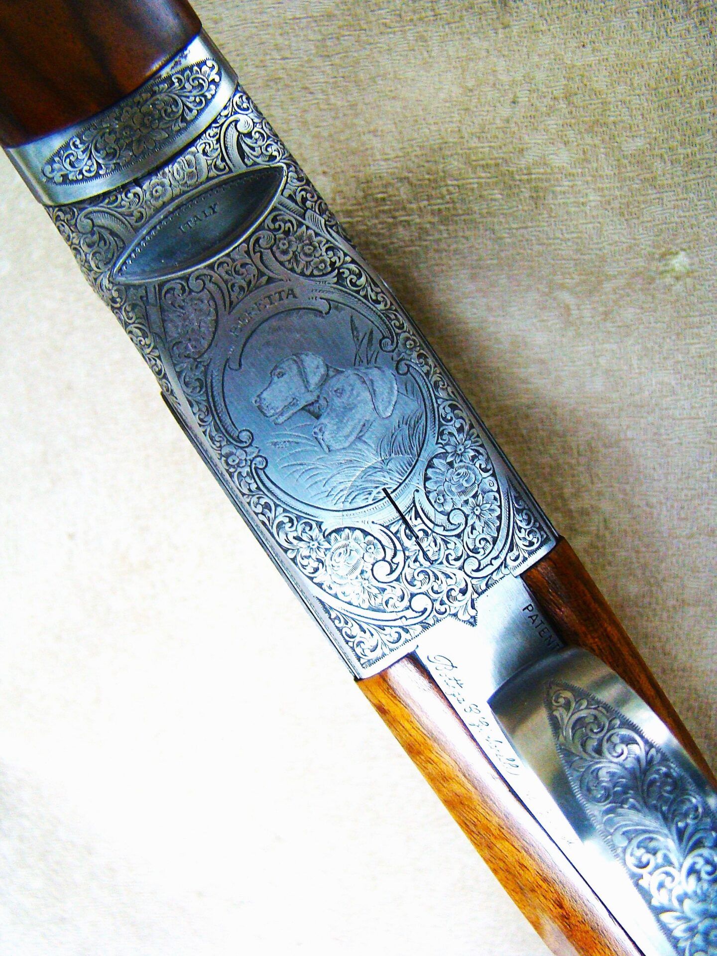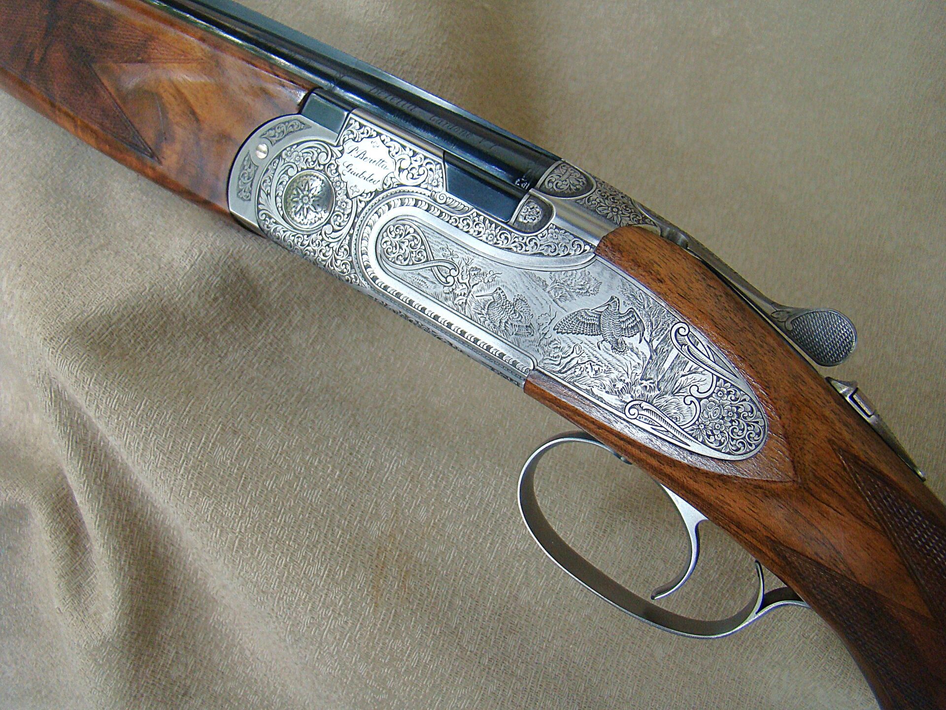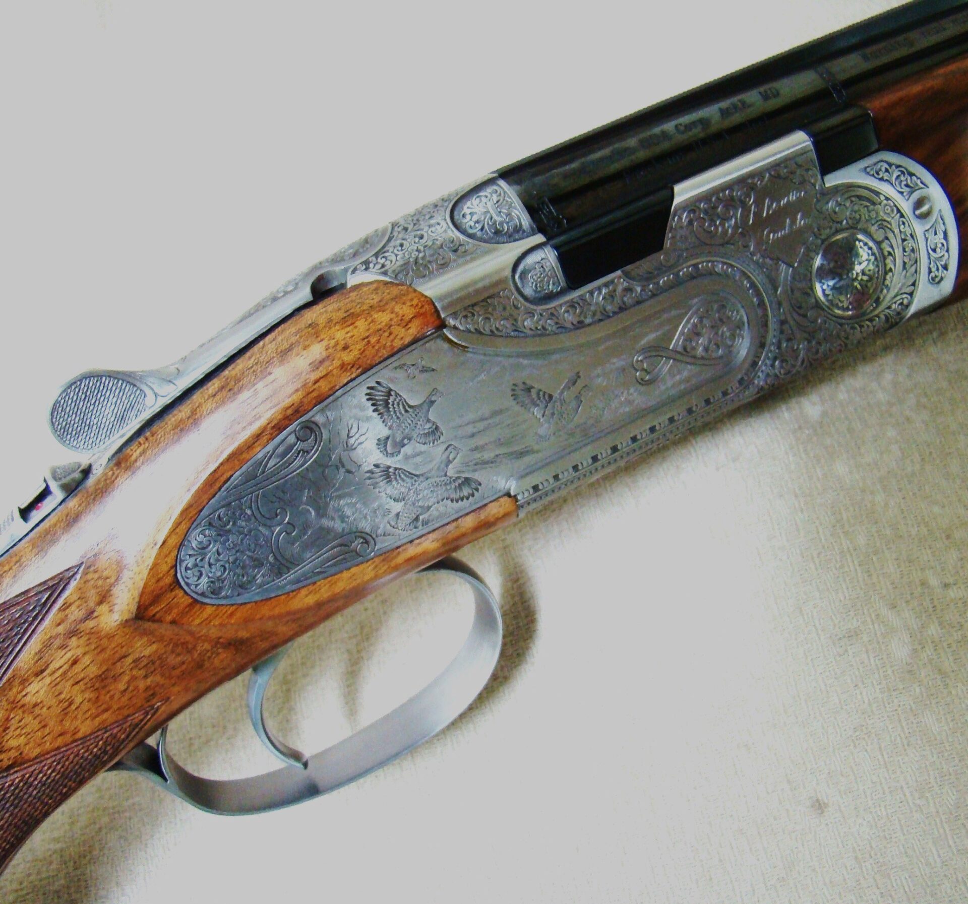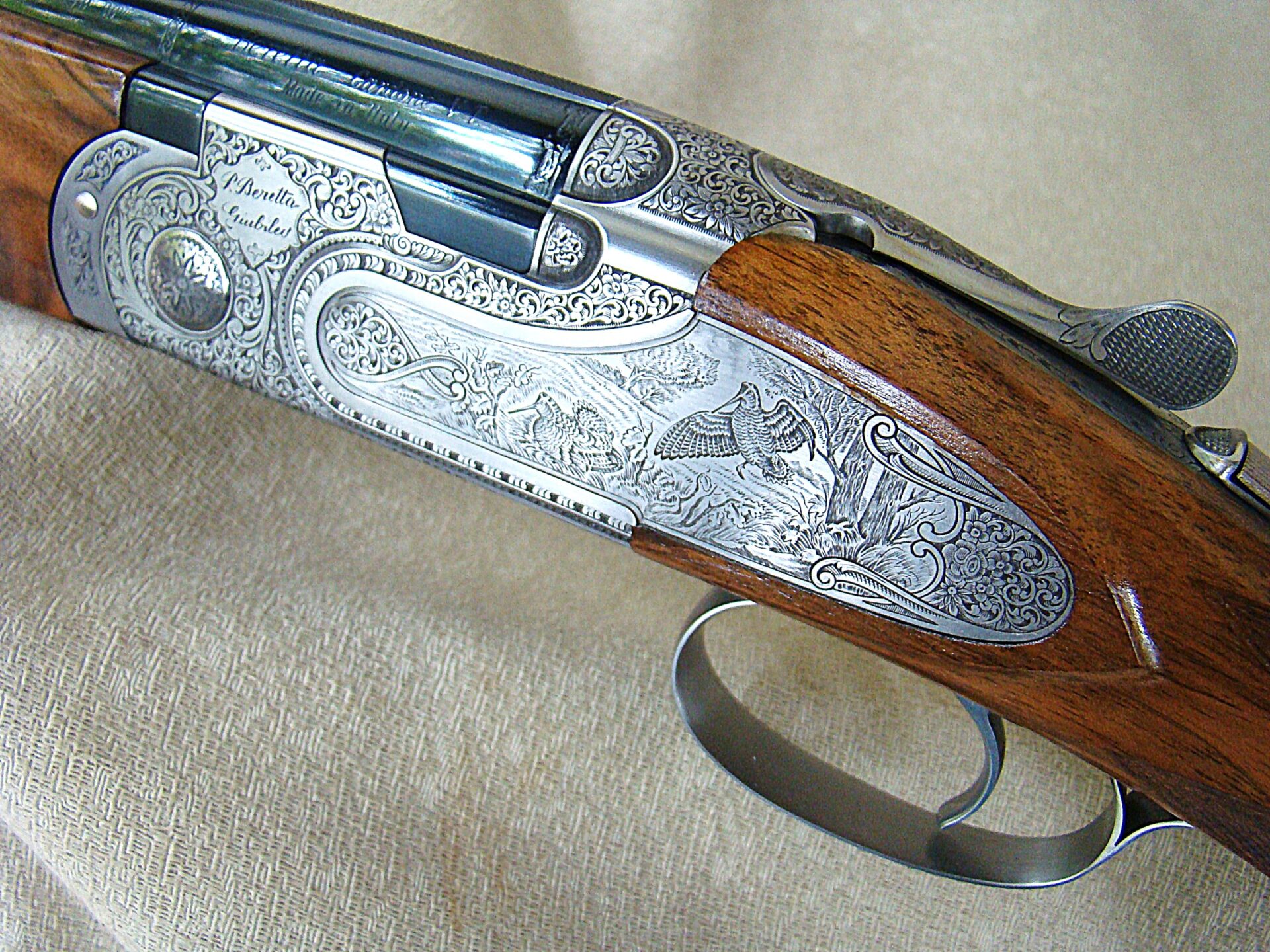 Fabulous Beretta 28 ga. Giubileo, 30″ Excelsior steel vent rib multichoke barrels, 2-3/4″ chambers. Top of the line side plated model features coin finished action with extensive game scenes and floral acanthus scroll. The Giubileo models are finished in the SO workshop to the highest standard of fit and finish. Pistol grip stock with extensive marbled figure against a caramel colored background measures 1-1/4″ comb, 2″ heel, 14-1/2″ LOPl over the checkered wood butt. Desirable 30″ barrels and weighing in at 6-1/2 lbs, translates into really great balance and swing. About new condition. Original case and shipping box.