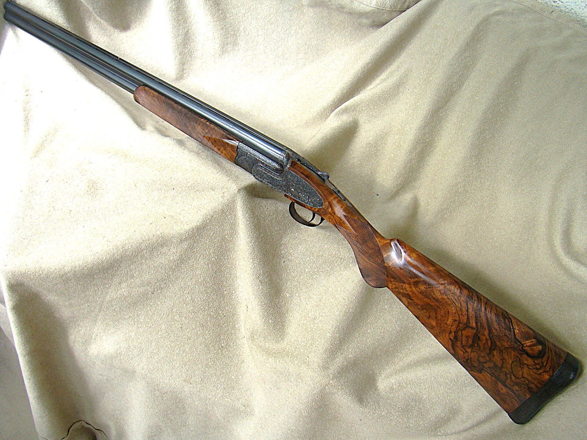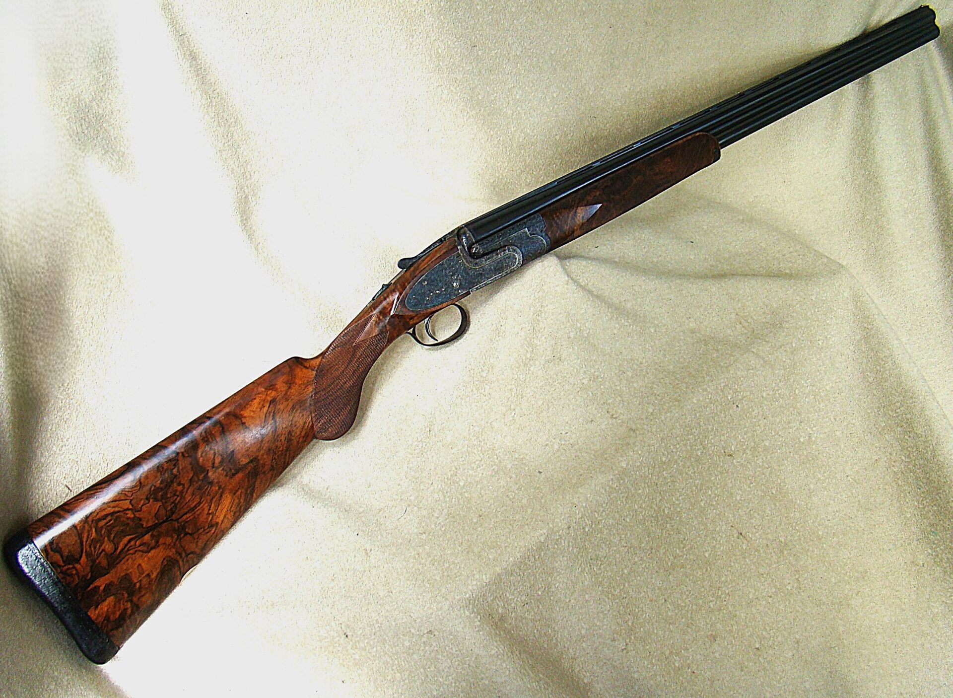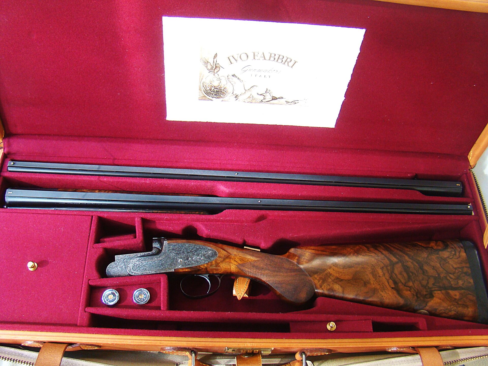 Fabbri Tipo Piccione Extra O/U. 12 ga, 2 sets of 28″ file cut tapered vent rib barrels. 2-3/4″ chambers Chokes No. 1: (.022/.010) imp/cyl imp/mod. Chokes No. 2: (.037/.028) full imp/mod. Sidelock case colored action with ribbon and scroll signed Iora. Single trigger ejectors and auto safe. Prince of Wales round grip stock of incredible exhibition bold black marble cake figure. Measures 1- 3/8″ comb, 2-3/8″ heel, 16″ LOP over beautiful black leather pad. Weighs 7 lbs., 5 oz. Fabbri guns are built to be the best money can buy! Original proof document and Bohler Super Blitz barrel certificate accompany this extraordinary Fabbri. Just wonderful condition. Complete in the Nizzoli full leather fitted case with Maker’s label.