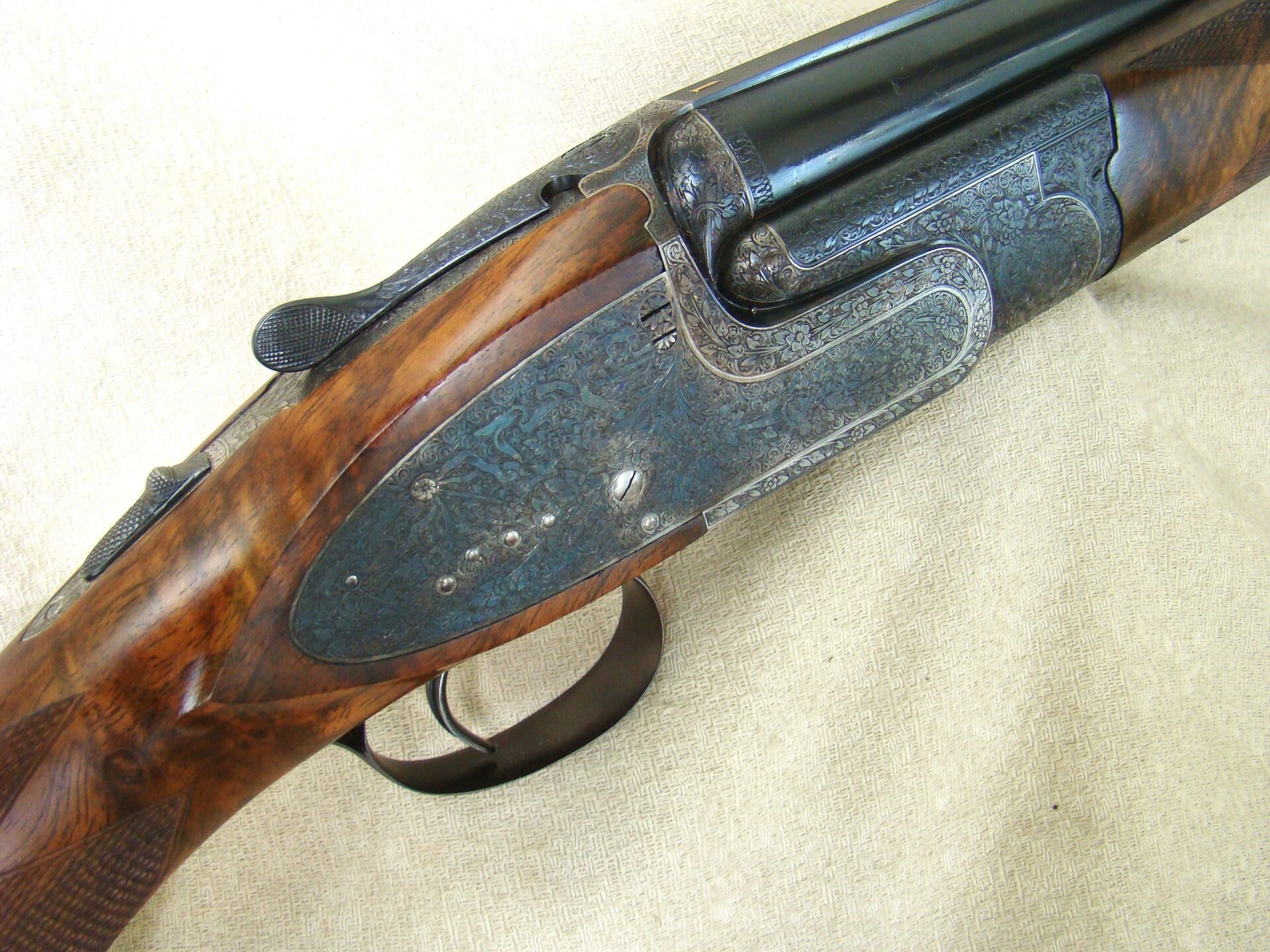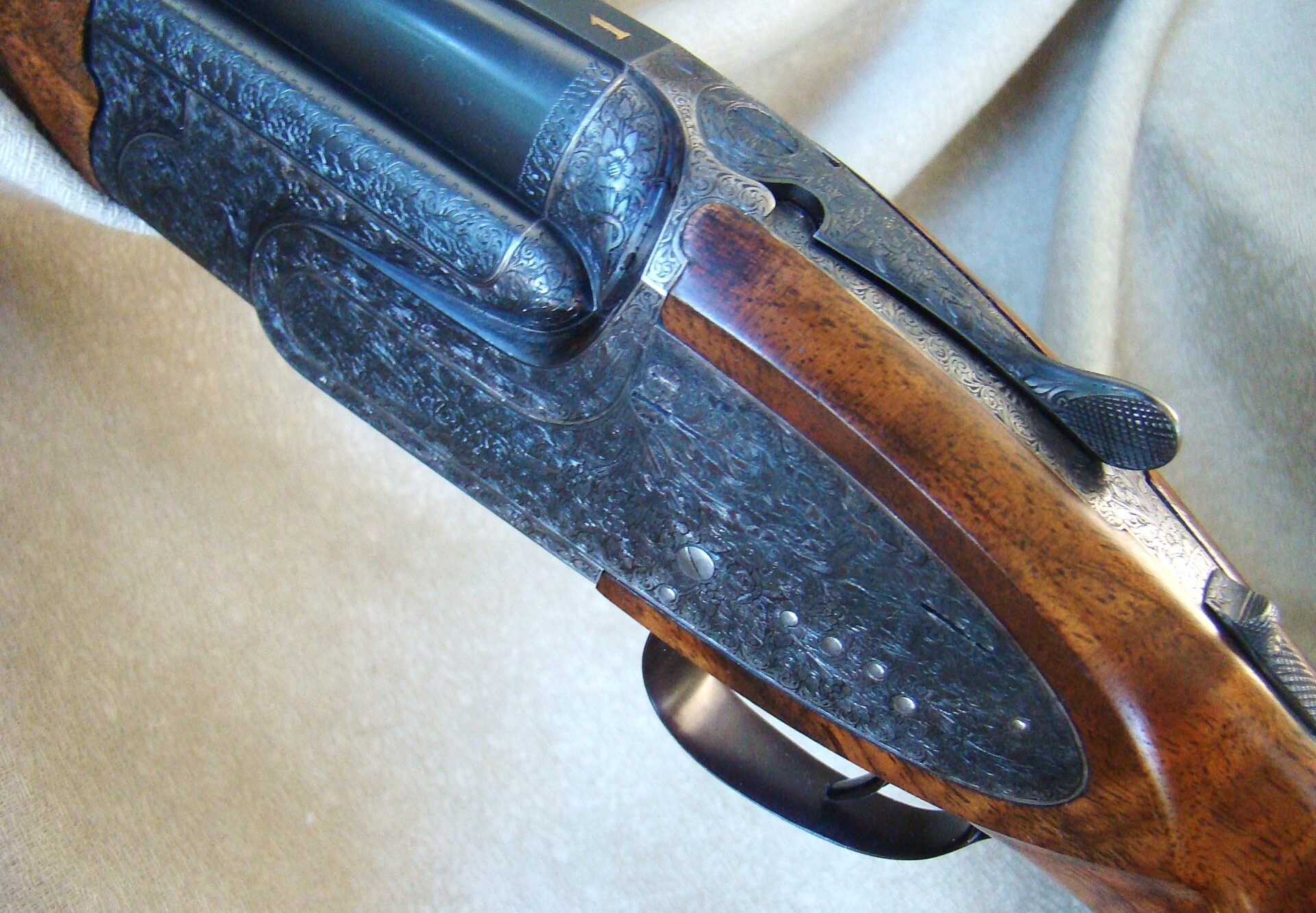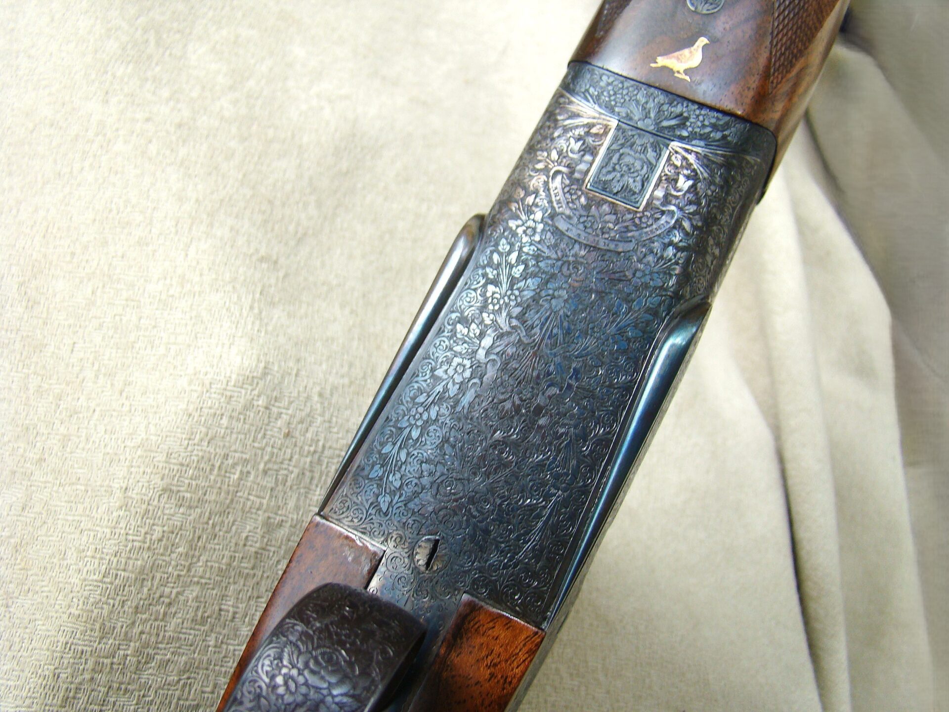 Fabbri Tipo Piccione Extra O/U. 12 ga, 2 sets of 28″ file cut tapered vent rib barrels. 2-3/4″ chambers Chokes No. 1: (.022/.010) imp/cyl imp/mod. Chokes No. 2: (.037/.028) full imp/mod. Sidelock case colored action with ribbon and scroll signed Iora. Single trigger ejectors and auto safe. Prince of Wales round grip stock of incredible exhibition bold black marble cake figure. Measures 1- 3/8″ comb, 2-3/8″ heel, 16″ LOP over beautiful black leather pad. Weighs 7 lbs., 5 oz. Fabbri guns are built to be the best money can buy! Original proof document and Bohler Super Blitz barrel certificate accompany this extraordinary Fabbri. Just wonderful condition. Complete in the Nizzoli full leather fitted case with Maker’s label.