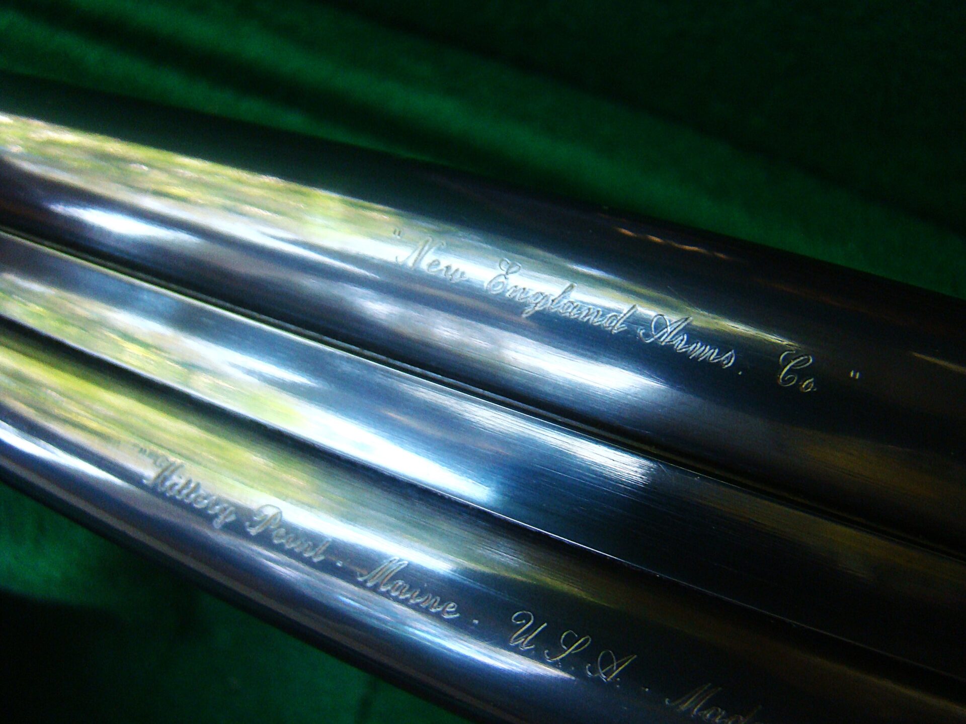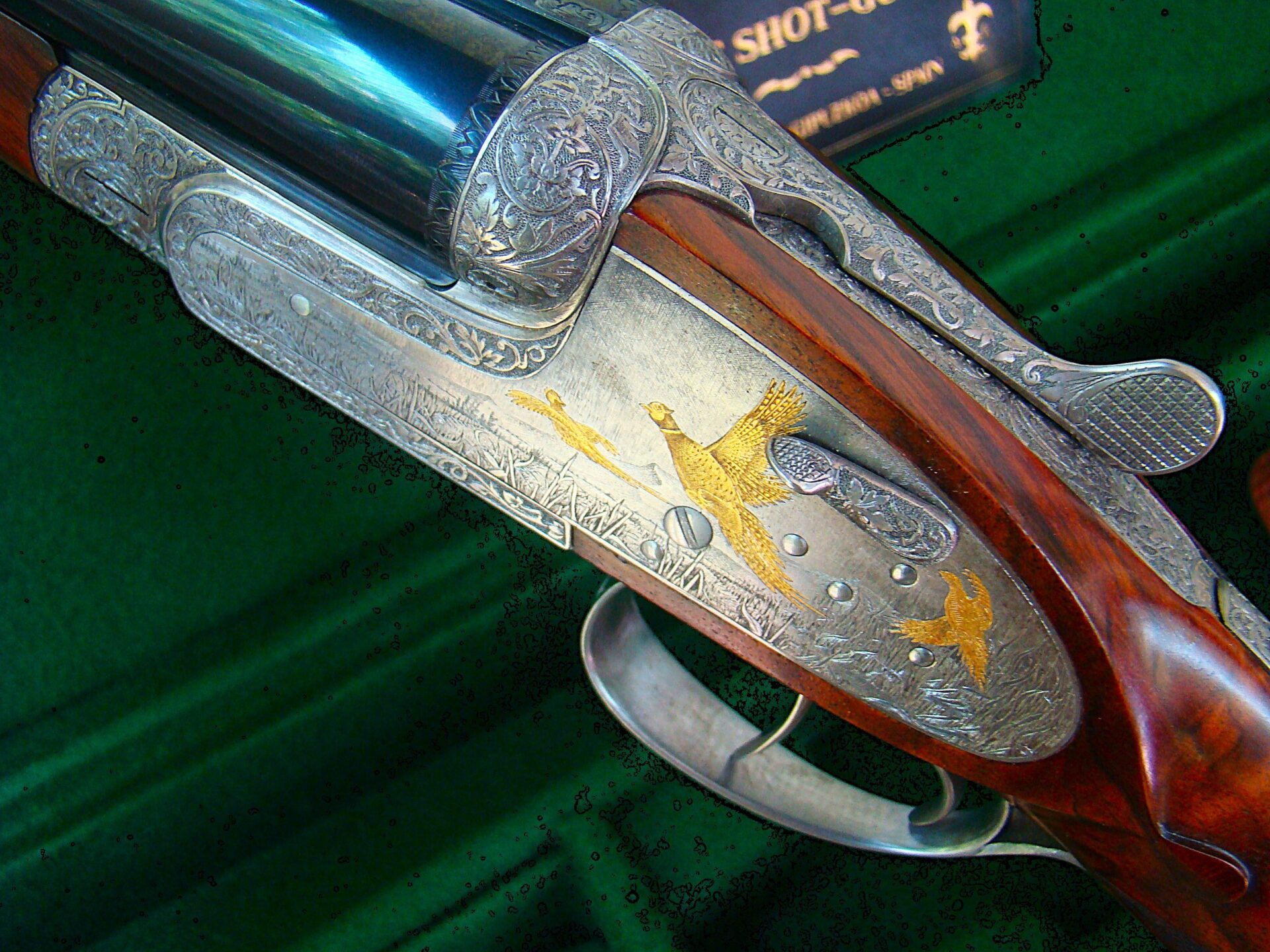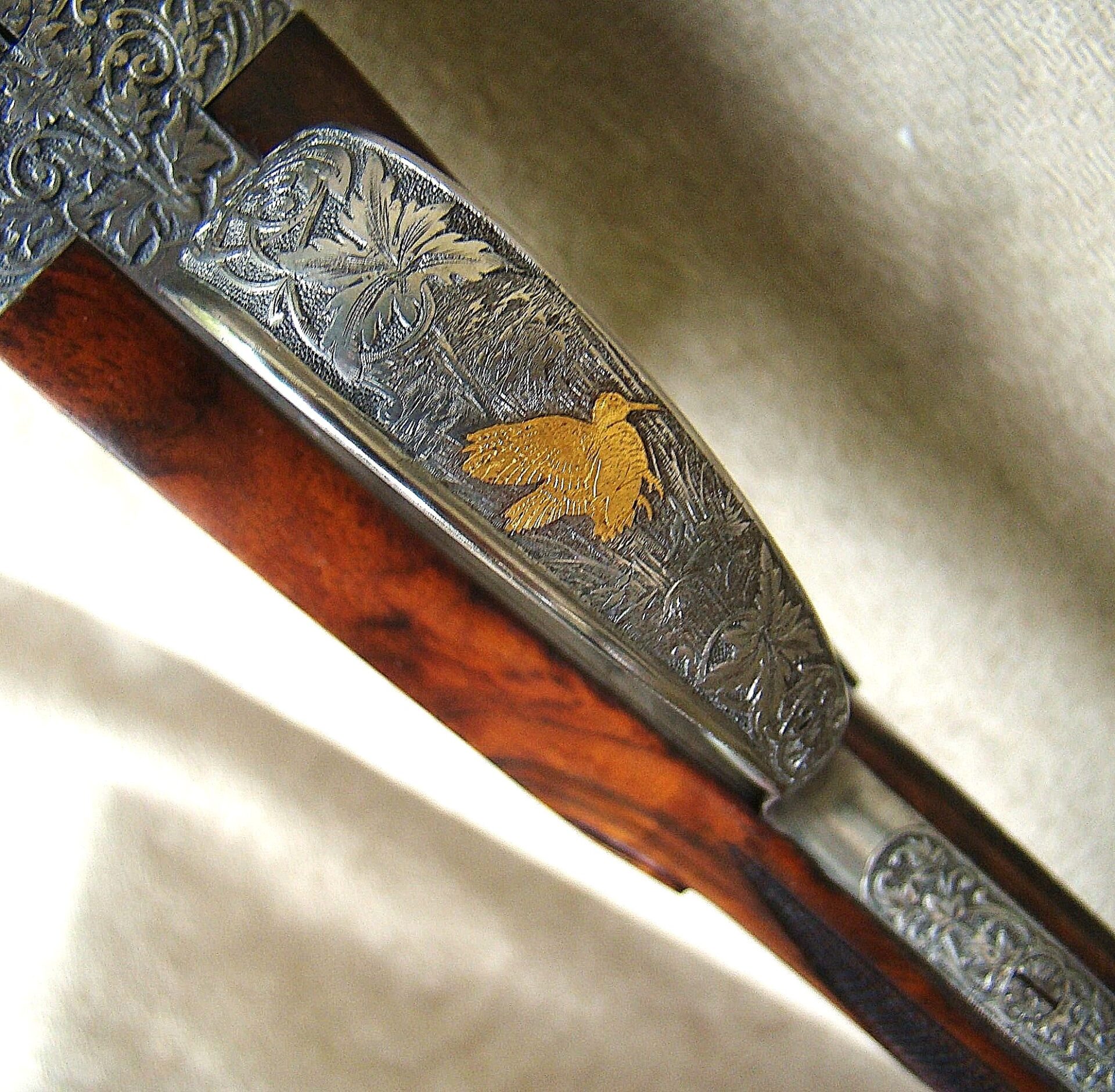 Exhibition grade Arrieta features 27.5″ barrels choked open improved and modified (.004/.008), 70mm chambers. The barrels are engraved “New England Arms”. Hand-detachable locks, double triggers, ejectors. Fabulous relief engraving and gold game birds by the Italian Master Dassa. This very gun was used as an example of a custom order Arrieta gun through New England Arms. As seen in the photos, this was an exhibition quality work and likely one of a kind. Magnificent burl walnut of outsanding color and figure. Stock measures 1-3/8″ comb, 2-1/4″ heel, 15″ LOP to a checkered butt. Slight cast off. 1998 production. Back in the day, New England arms was one of the largest dealer/importers of fine guns. This appears to be an all out best effort. Just incredible at less than 1/3 cost. Weighs just 6 lbs., 2 oz.,remains in new condition with Maker’s case.