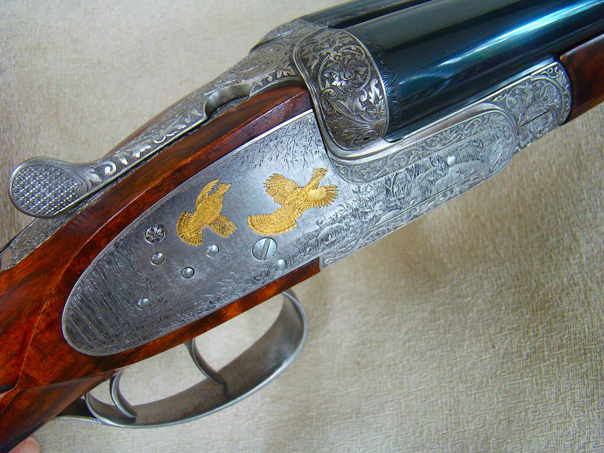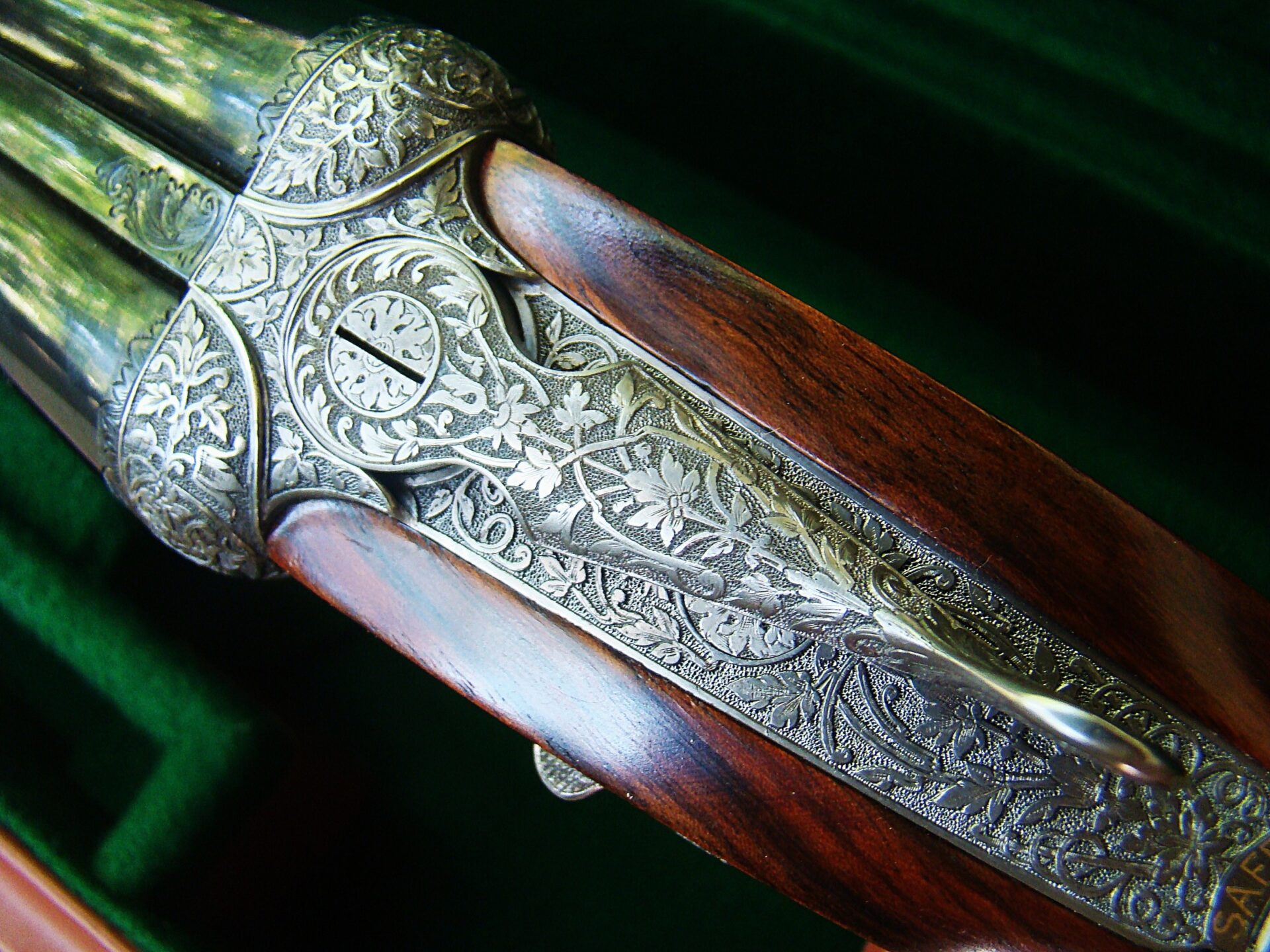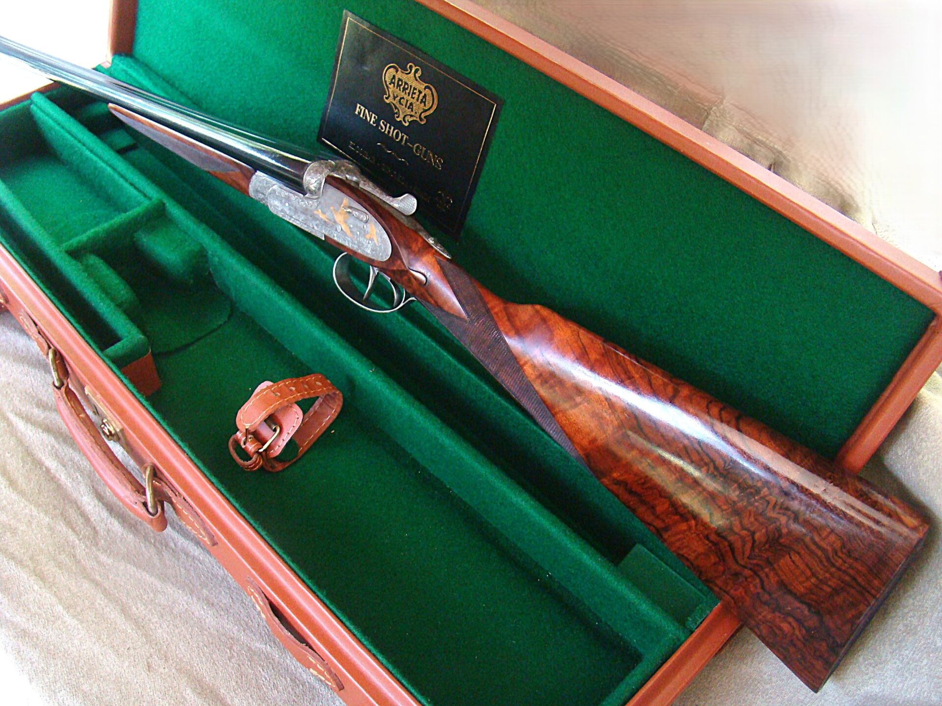 Exhibition grade Arrieta features 27.5″ barrels choked open improved and modified (.004/.008), 70mm chambers. The barrels are engraved “New England Arms”. Hand-detachable locks, double triggers, ejectors. Fabulous relief engraving and gold game birds by the Italian Master Dassa. This very gun was used as an example of a custom order Arrieta gun through New England Arms. As seen in the photos, this was an exhibition quality work and likely one of a kind. Magnificent burl walnut of outsanding color and figure. Stock measures 1-3/8″ comb, 2-1/4″ heel, 15″ LOP to a checkered butt. Slight cast off. 1998 production. Back in the day, New England arms was one of the largest dealer/importers of fine guns. This appears to be an all out best effort. Just incredible at less than 1/3 cost. Weighs just 6 lbs., 2 oz.,remains in new condition with Maker’s case.