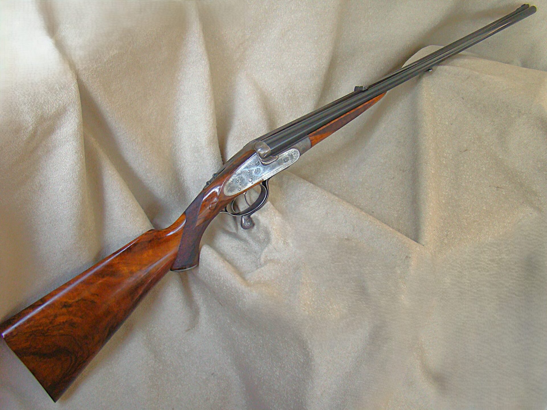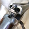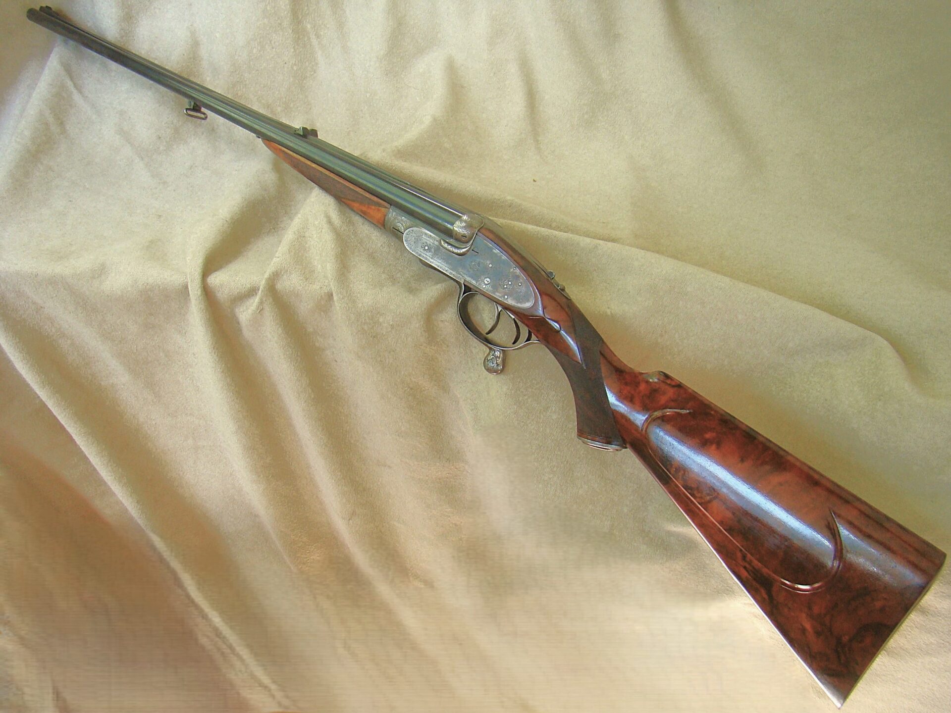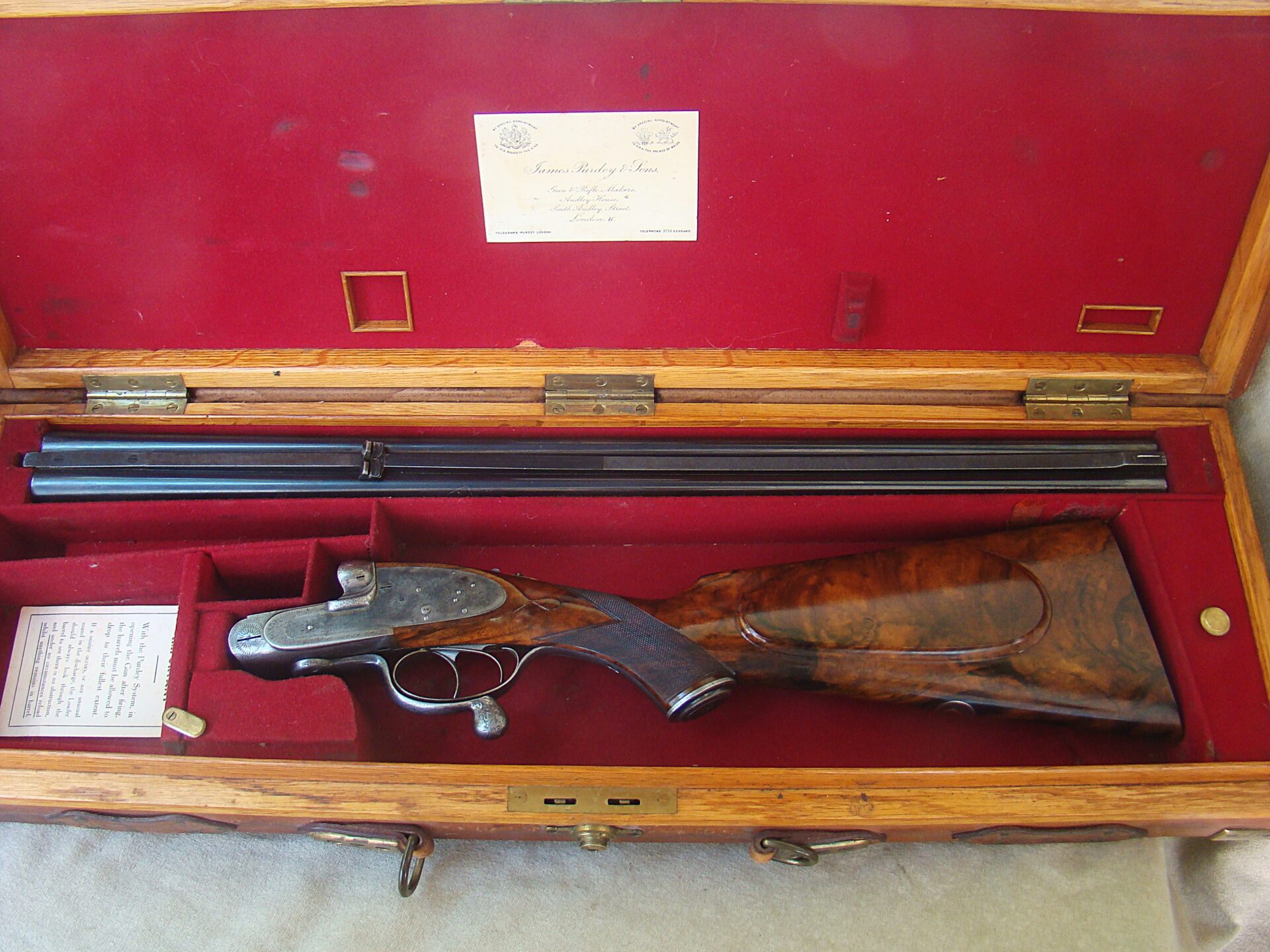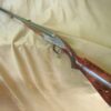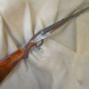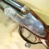 J. Purdey cal. 303 sidelock double rifle, 25-1/2″ chopper lump barrels with rib inscribed “Sir Joseph Whitworth pressed steel”. Proofed for 37 grains riflelite.    One standing, two folding rear sights regulated at 100/200/300 yards.  “J.Purdey & Sons  Audley House South Audley Street London” completes the barrel address.  The bolstered swing underlever side clip action employs the Purdey self opening system, and an actuated third bite engaged as the lever snaps closed.  Quite a bit of engineering here insuring a rock solid closure.  This was an era of design and competition, Purdeys were not to be outdone!  Wonderful rose and scroll in the Purdey house pattern, 100% coverage of the action and locks.  Double triggers, bolted safety. The action and locks retain a blush of pleasing color hardening.  Splinter for end and pistol grip stock of fabulous figured French walnut of rich amber color and striking black smokey burl figure throughout.  Graced with classic oval cheek piece, the length of pull is 14-1/2″ to a checkered butt.  The Medford rifling is excellent.  Weight 9 lbs., 6 oz. This wonderful Purdey rifle completed in 1897 can be sold directly as an Antique. Original oak and leather case with Maker’s label.
