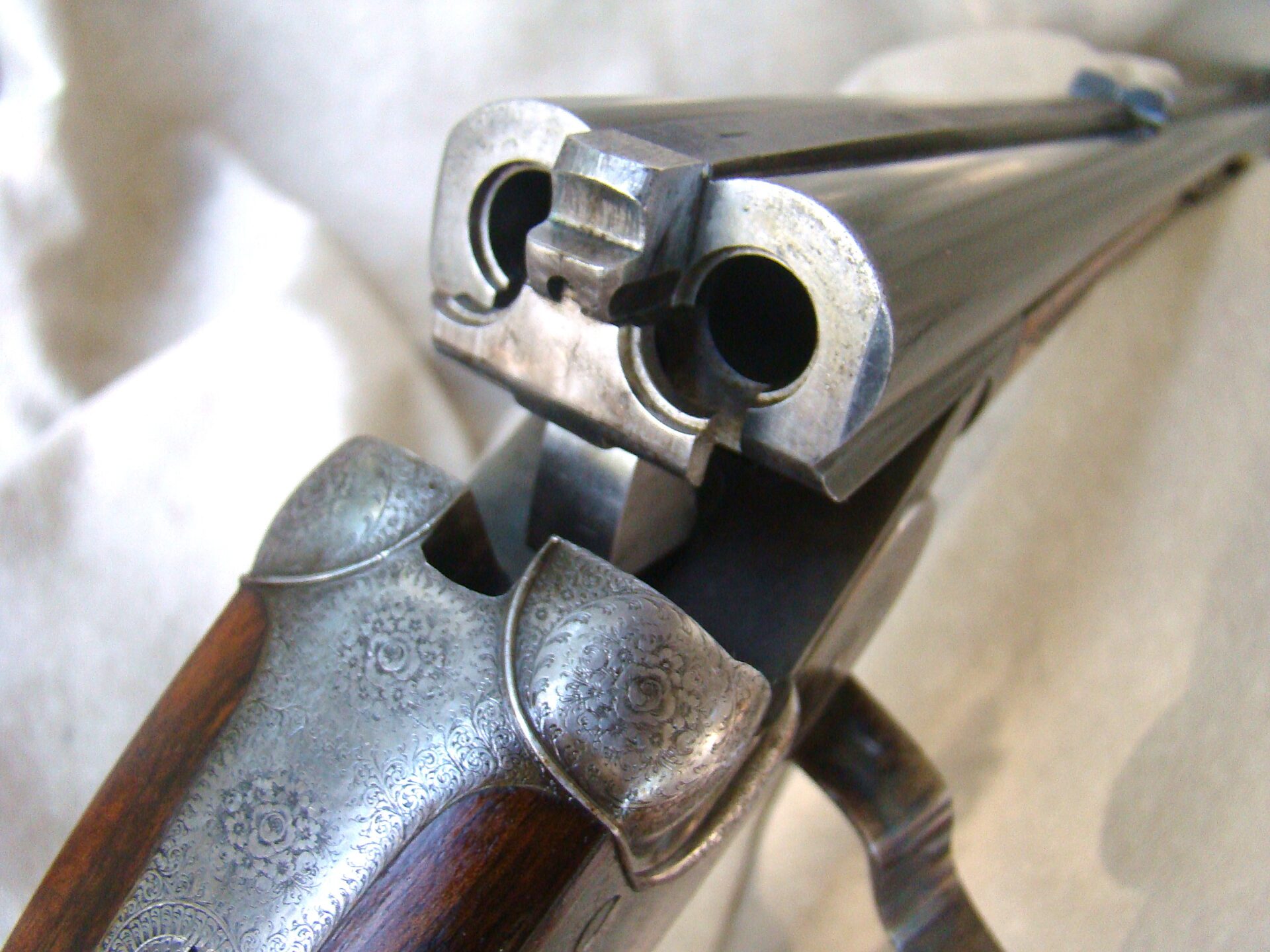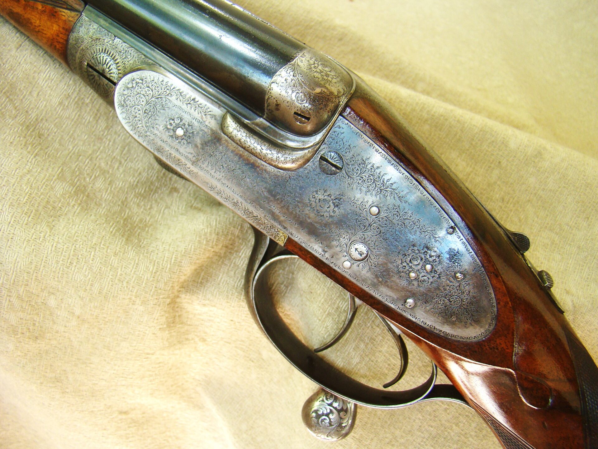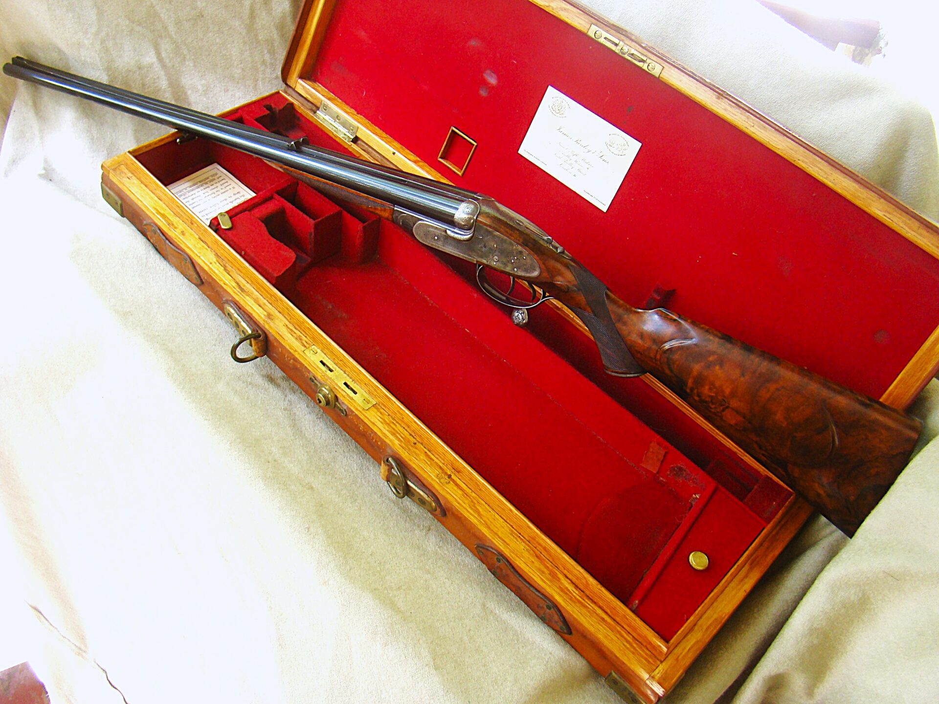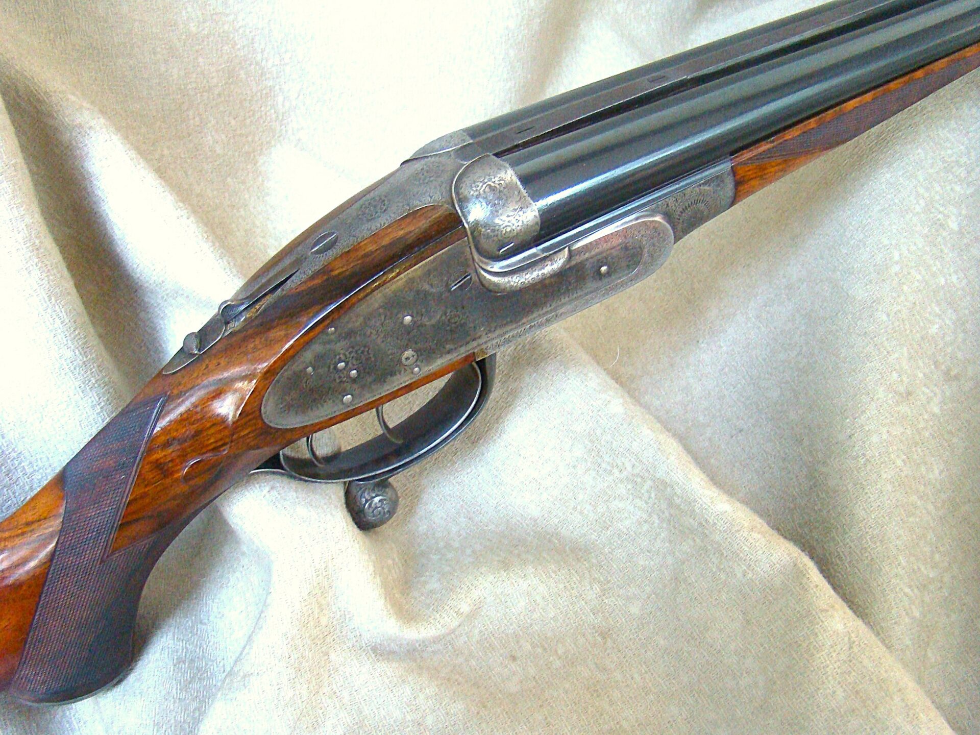 J. Purdey cal. 303 sidelock double rifle, 25-1/2″ chopper lump barrels with rib inscribed “Sir Joseph Whitworth pressed steel”. Proofed for 37 grains riflelite.    One standing, two folding rear sights regulated at 100/200/300 yards.  “J.Purdey & Sons  Audley House South Audley Street London” completes the barrel address.  The bolstered swing underlever side clip action employs the Purdey self opening system, and an actuated third bite engaged as the lever snaps closed.  Quite a bit of engineering here insuring a rock solid closure.  This was an era of design and competition, Purdeys were not to be outdone!  Wonderful rose and scroll in the Purdey house pattern, 100% coverage of the action and locks.  Double triggers, bolted safety. The action and locks retain a blush of pleasing color hardening.  Splinter for end and pistol grip stock of fabulous figured French walnut of rich amber color and striking black smokey burl figure throughout.  Graced with classic oval cheek piece, the length of pull is 14-1/2″ to a checkered butt.  The Medford rifling is excellent.  Weight 9 lbs., 6 oz. This wonderful Purdey rifle completed in 1897 can be sold directly as an Antique. Original oak and leather case with Maker’s label.