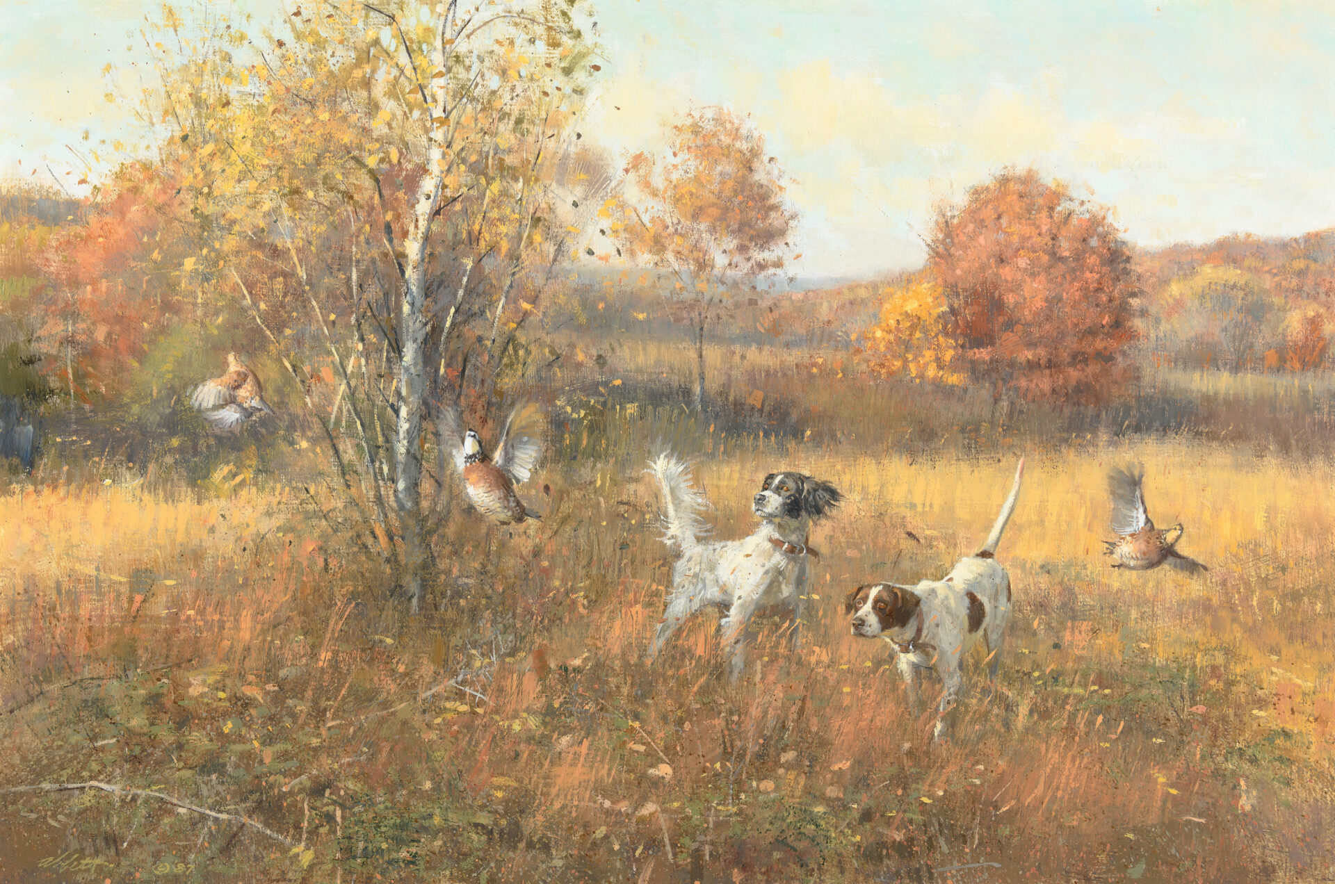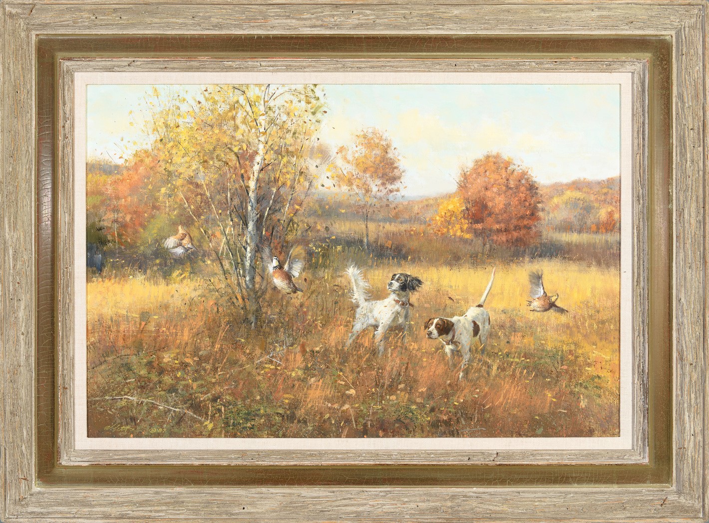 “Quail Flush” by famed sporting artist Robert Abbett (1926-2015). Wonderful oil on canvas depicting a setter and pointer with a dramatic burst of Quail taking flight. Beautifully framed size 28″x38″. Painting size 20″ x 30″. Signed Abbett on the lower left and dated 1987. A wonderful composition by Abbett in absolutely perfect condition.