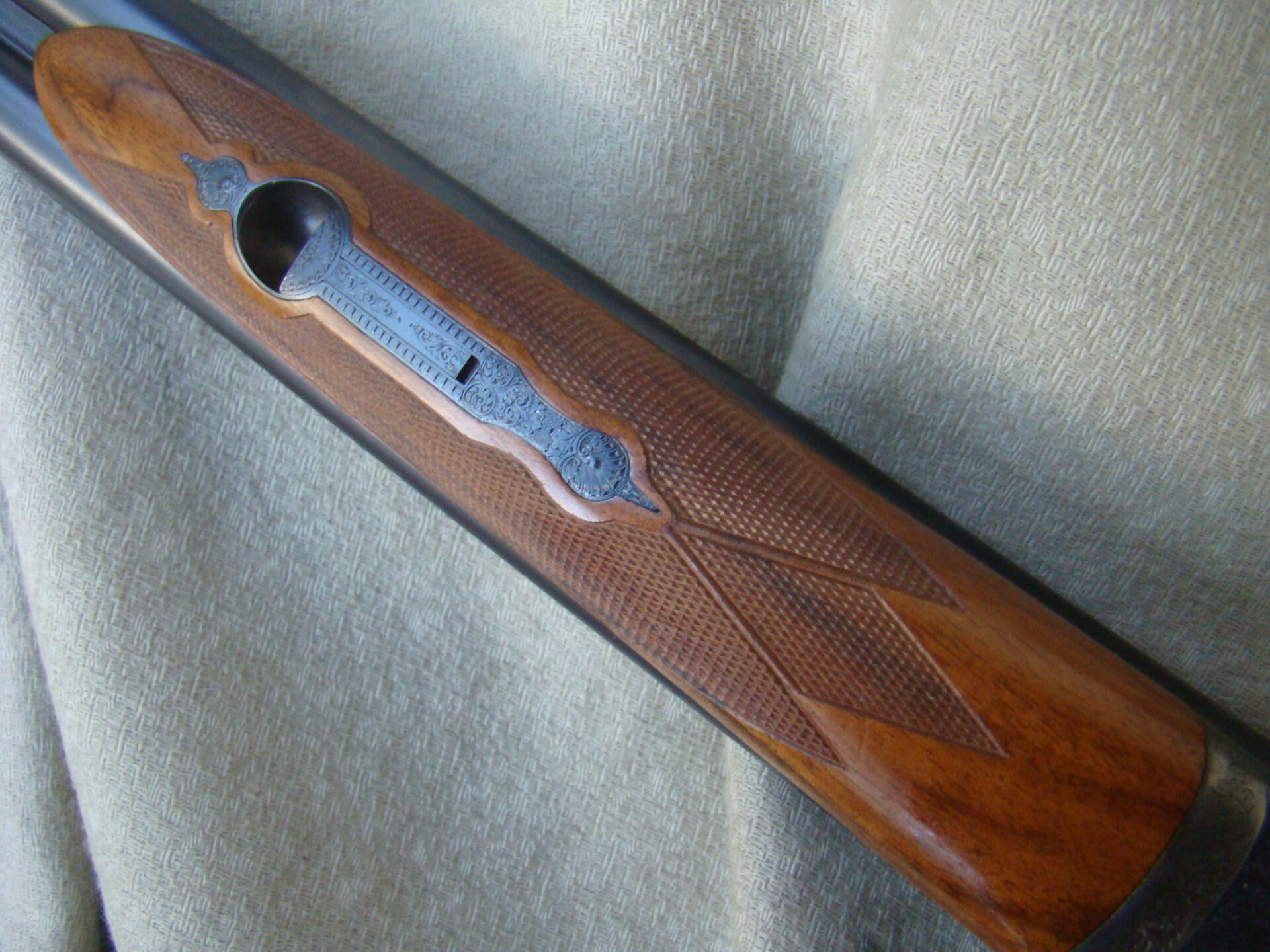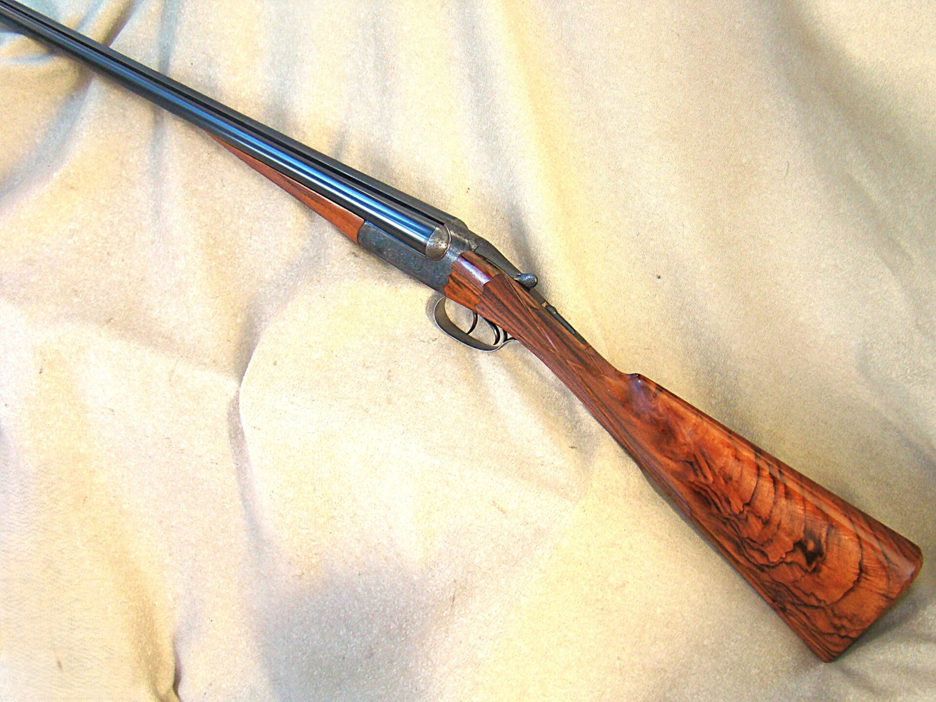 Best quality Westley Richards droplock 20 ga., 28″ barrels, game rib. Choked improved and modified (.006/.013), 2-3/4″ chambers.
