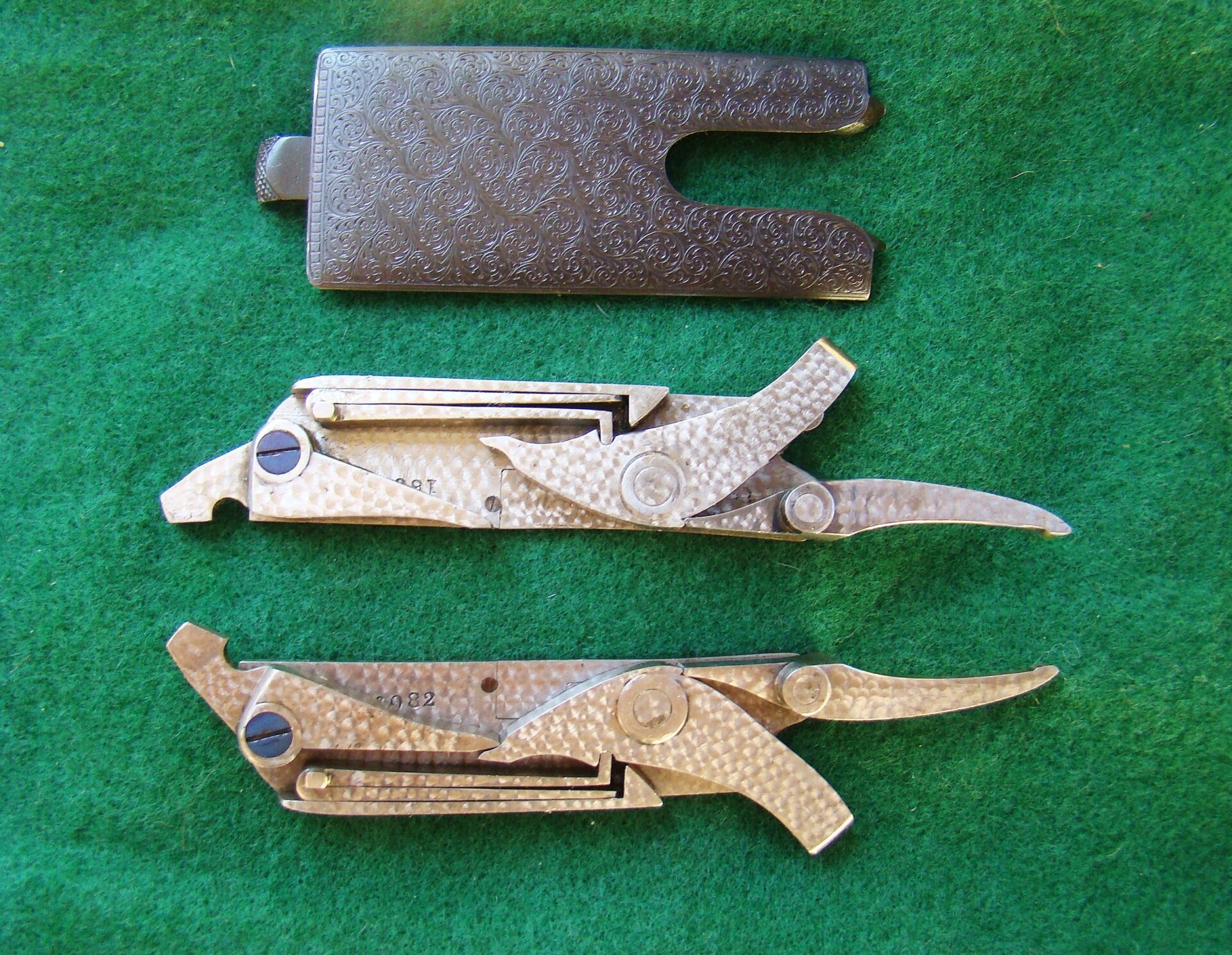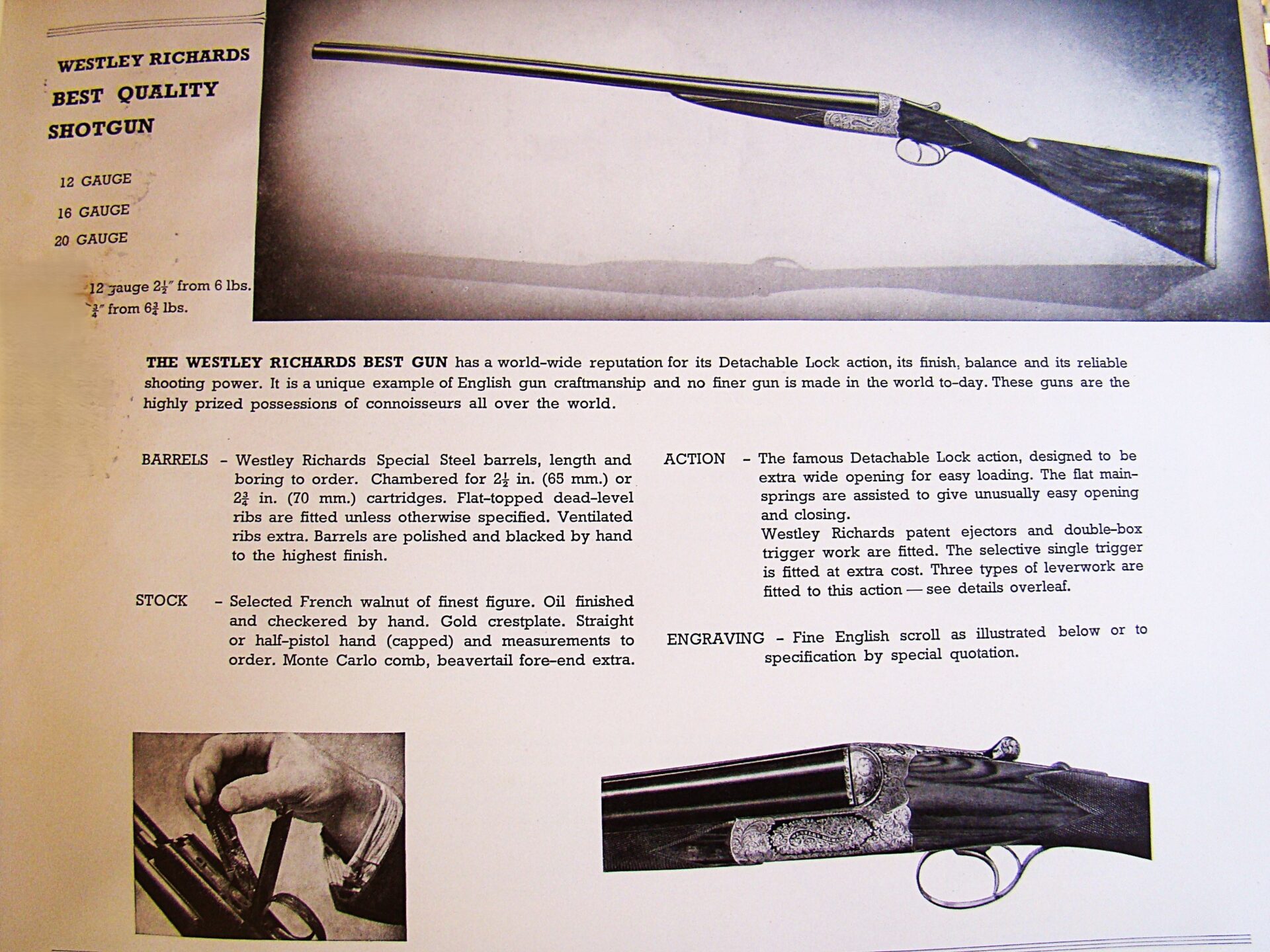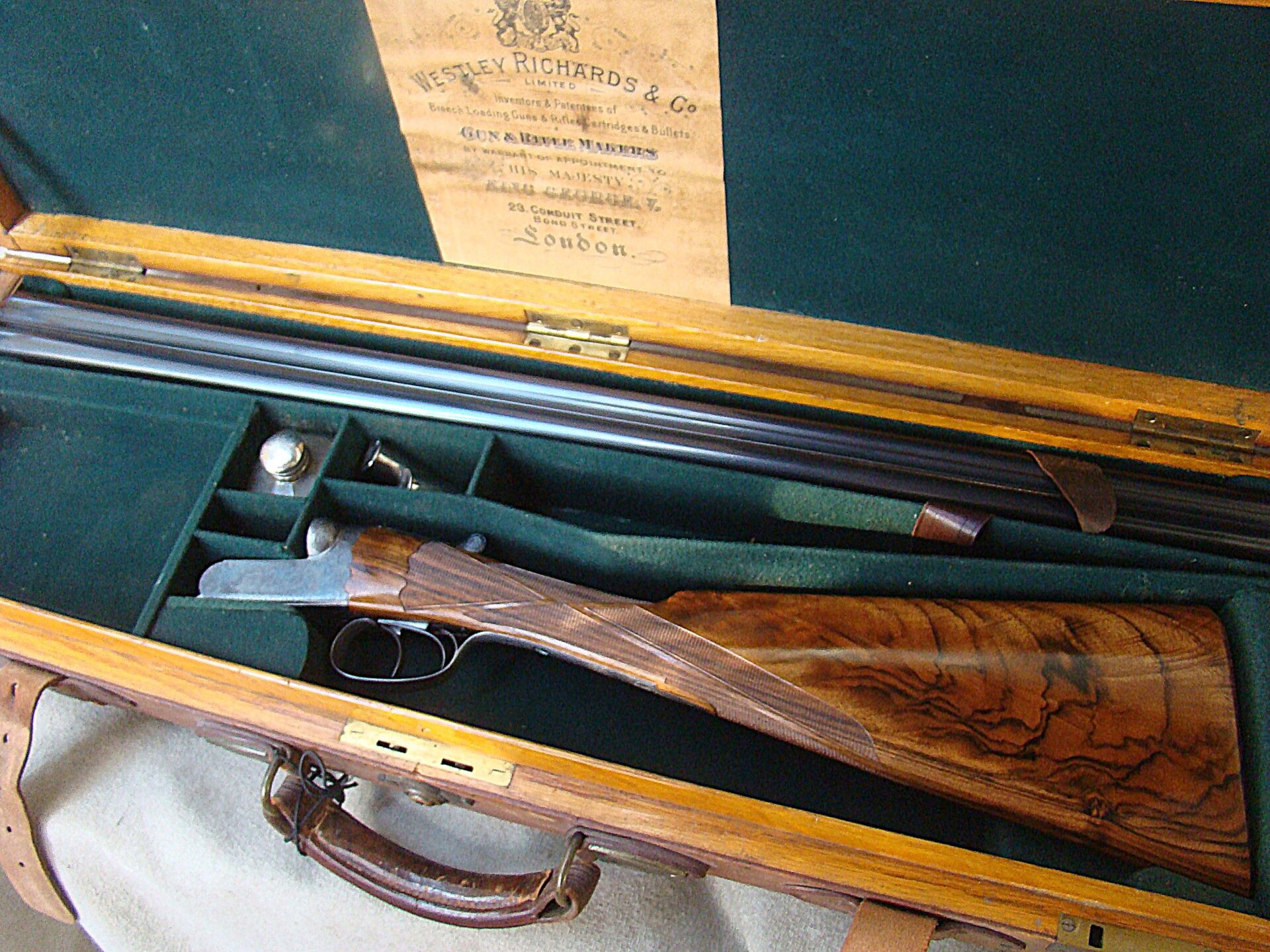 Auto ejectors, auto safe, double triggers. Scalloped back action features the signature Westley sliding top bolting. A patina of darkened case color provides a background for the fine scroll engraving in Westleys “Best” pattern. The removable bottom cover reveals the finely polished detachable locks. Deluxe checkering. Straight hand stock of the most fabulous feather crotch and black figure is just stunning. Measures1-3/8″ comb, 2 1/4″ heel, 14-1/2″ LOP to a checkered butt, slight cast off. Weighs 5 lbs., 12 oz. A fabulous small bore drop lock. Complete with factory oak and leather case.